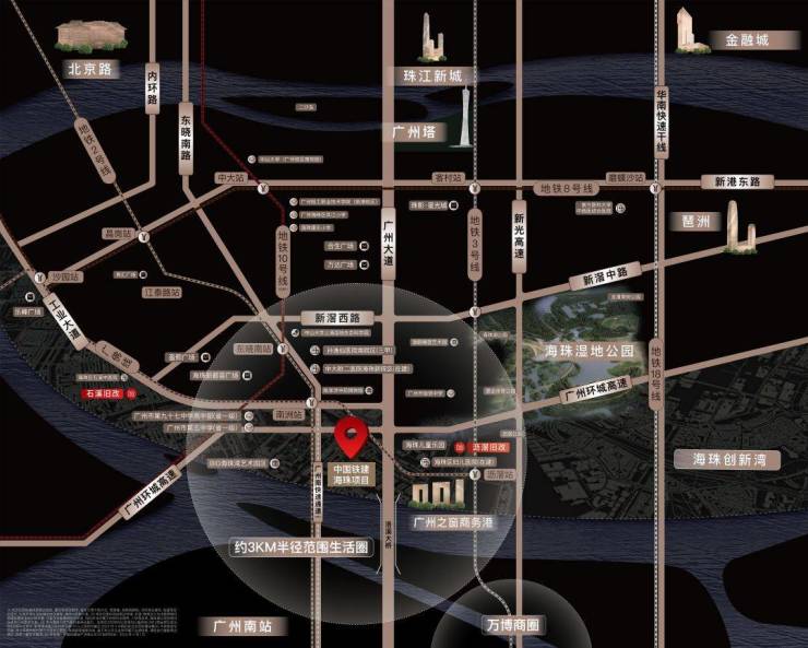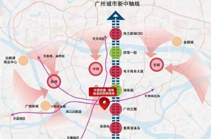 项目位于广州城市新中轴,该中轴贯穿天河北、珠江新城、广州塔,落点新中轴最后一公里,汇聚资源利好;项目同时作为广州城市南门户,将迎接来自湾区乃至世界宾客,打造具有标志性、未来感、烟火气世界一流的城市门厅。
