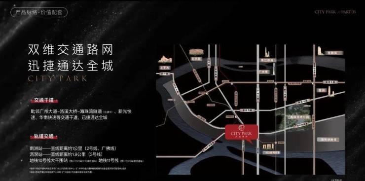 如果选择开车的话,附近还有洛溪大桥、环城高速和广州大道南等,开车到琶洲、珠城和金融城等重点板块十几分钟,相当方便。