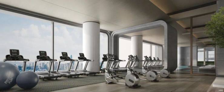 配备丰富器材的云端健身中心,与楼下绿意掩映的社区跑道,