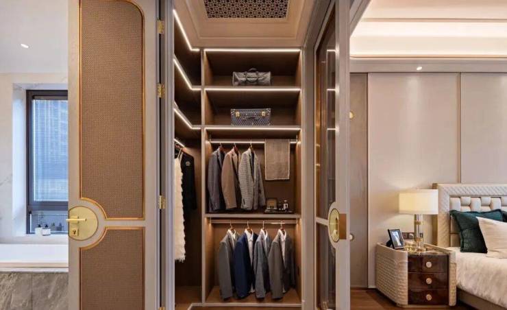 🌙 三行两排晶莹剔透玻璃衣柜,满足男女主人放置衣物饰品的需求;
