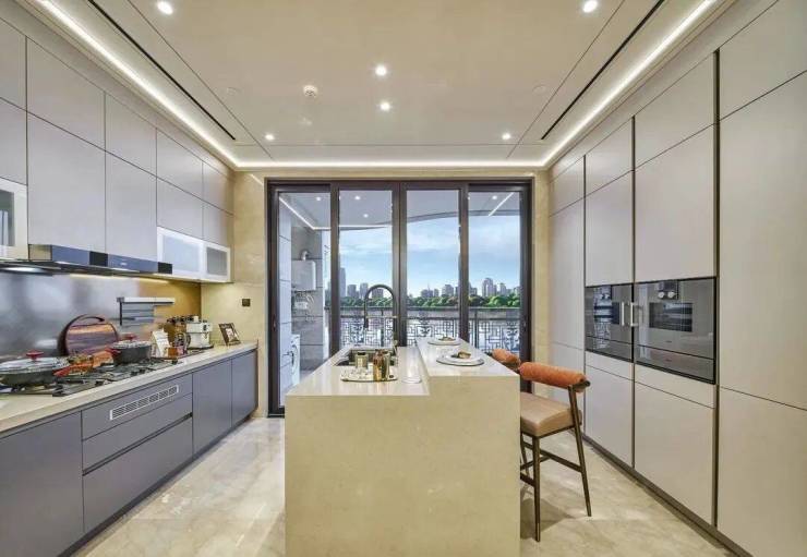 🌟墙壁使用香雪灰奢石,厨房门采用玫瑰金金属外框玻璃门;