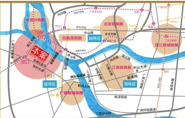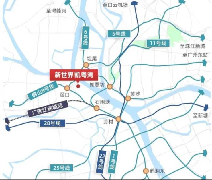 项目距离地铁5号线首发站滘口站约500米,无需换乘直达珠江新城;周边还有11号线石围塘站(在建)、未来白鹅潭站(1/11/22/28号线交汇),自驾可通过珠江大桥、鹤洞大桥、洲头咀隧道等快速通达广佛核心区。
