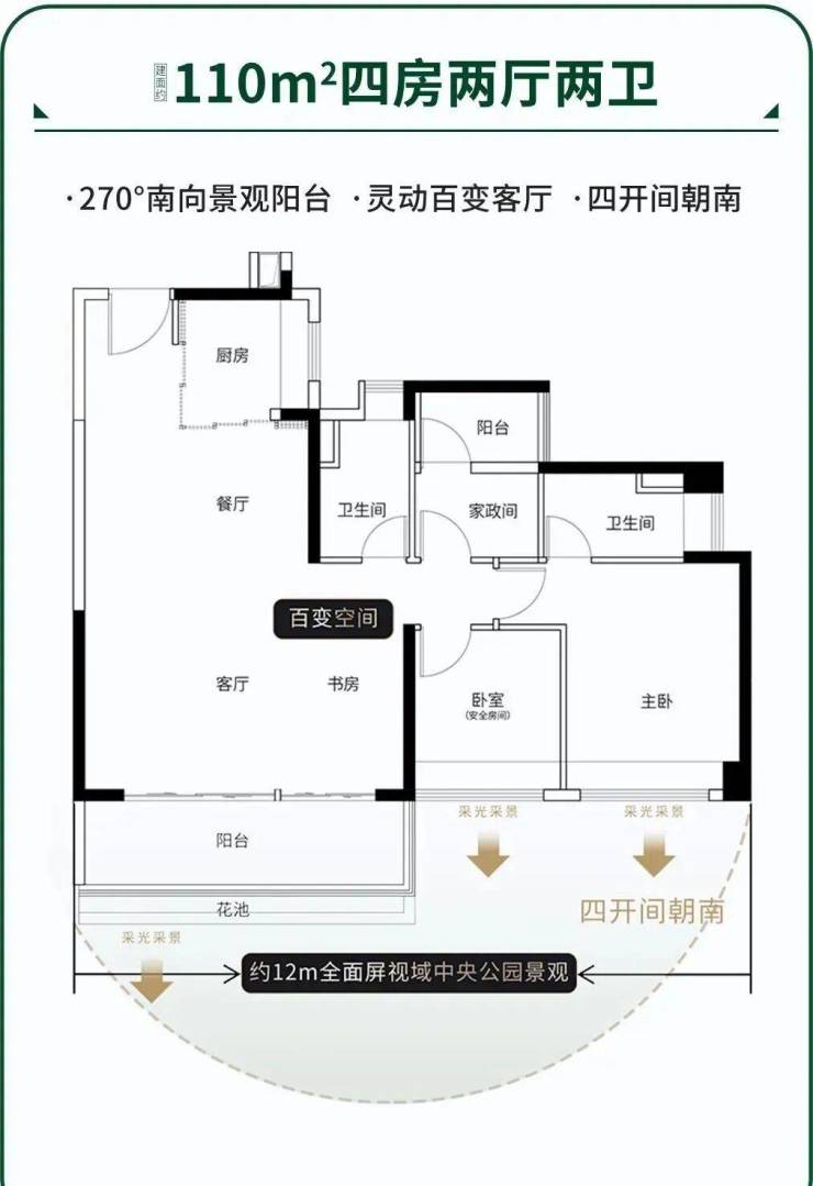 建面110平三房两卫,12米的采光面,厅出阳台,270度南向景观阳台