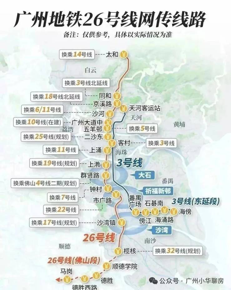 26号线相当于3号线的姐妹线,同时换乘站点极多。从这条线出发,可以快速通达体育系、珠江新城、琶洲、金融城、杨箕、二沙岛等核心产业和商圈带。