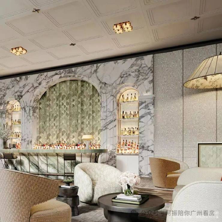 在设计上,入户大堂有8-9米的挑高,还做了卢浮宫阿波罗长廊的灵感设计;参照星级酒店打造高定会所,健身房,以及内部中心立体园林。