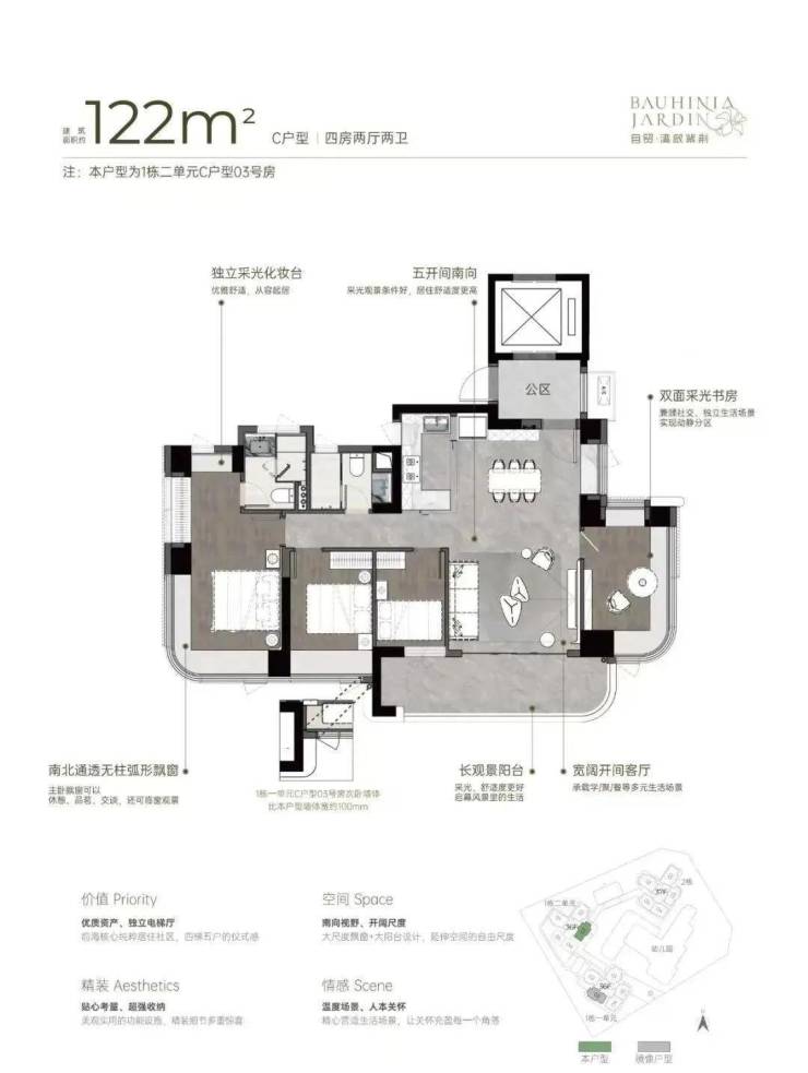 双龙抱珠户型,书房分布于客厅另一侧,且难得是双面采光+270°景观视野。主卧南北通透,且拥有十分开阔的景观面。贯通式阳台联通客厅以及靠近动区的次卧,实现长观景阳台。