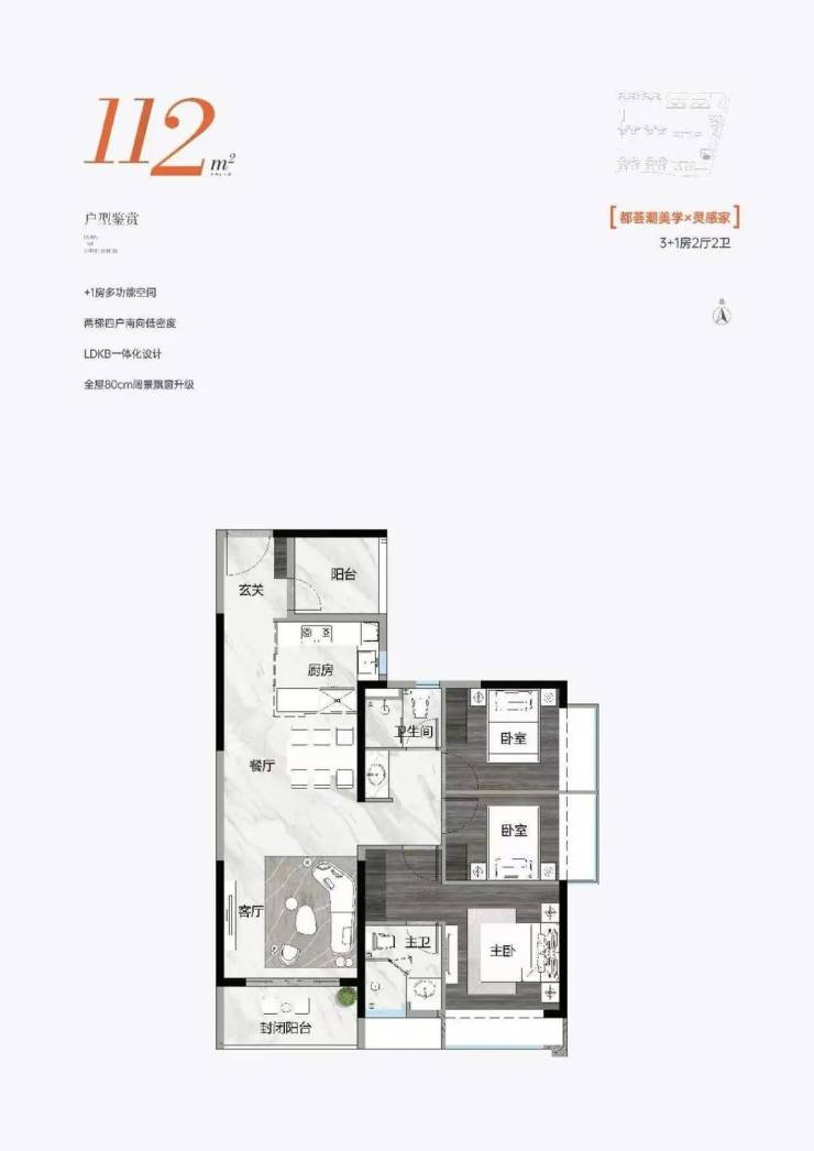 112㎡ 3+1房2厅2卫,+1房多功能空间,两梯四户南向低密度,LDKB一体化设计,全屋80cm阔景飘窗升级