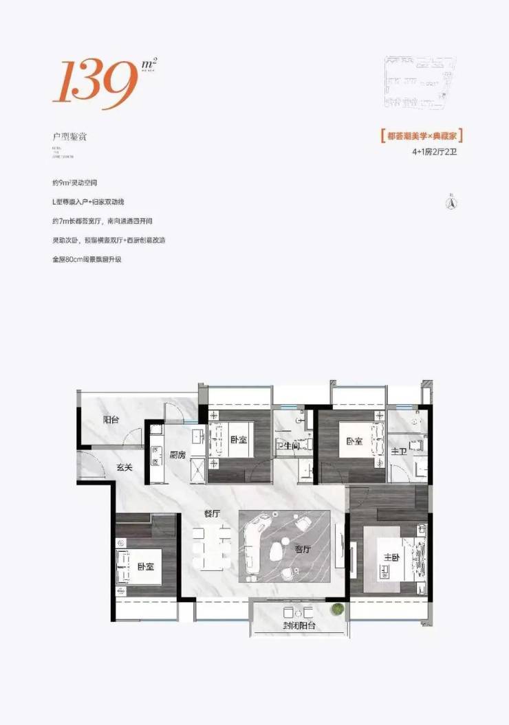 139㎡ 4+1房2厅2卫,约9㎡灵动空间,L型尊崇入户+归家双动线,约7m长都荟宽厅,南向通透四开间,灵动次卧,预留横竖双厅+西厨创意改造,全屋80cm阔景飘窗升级