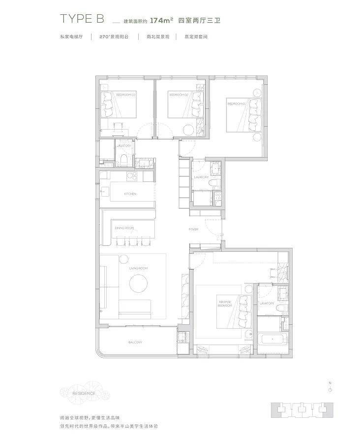 合生缦云主打改善型住宅,户型面积范围在140㎡至325㎡之间。项目提供南北双园景设计,270度超广角观景视野,以及3面开窗的户型设计,保证了良好的采光与通风。主套房配有步入式衣帽间和独立电梯厅,充分考虑了业主对私密性和舒适度的需求。整体户型设计高实用率,最大限度提升空间使用效率,满足不同家庭的需求。