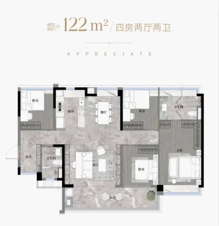 二期的10#,位置在小区中间,更加安静,定价比起去年卖的一期贵,当然,使用率方面,跟一期比起来也做了进一步提升,算上花池、阳台跟飘窗等赠送面积,使用率接近130%,主力的户型只有两个,分别是建面约105m²的四房和建面约128m²的四房。