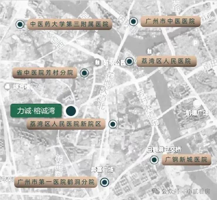 广州市第一医院鹤洞分院、广州市中医医院和惠爱医院。前沿综合医院环绕,全面照护:省中医院芳村分院、中医药大学第三附属医院、荔湾区人民医院、荔湾区人民医院新院区(已运营)和广钢新城医院等。