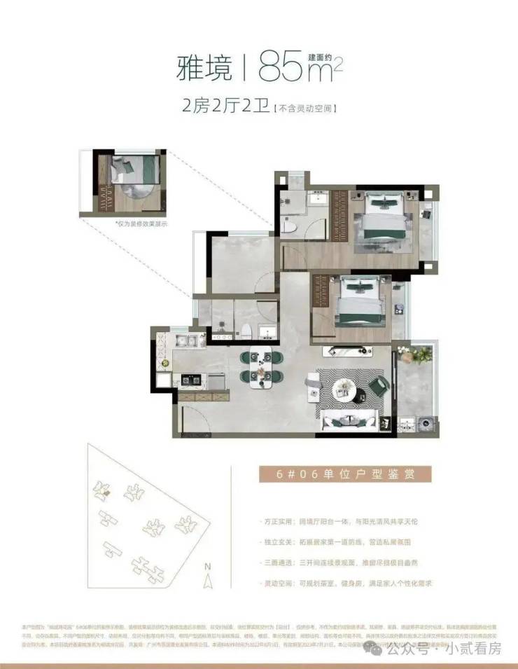 建面约85㎡,主城瞰江小户,小面积也能轻松瞰江,三开间连续景观面,客厅阳台一体,引江景入室,让揽江生活不再是奢望,而且这个户型是楼盘最便宜的。