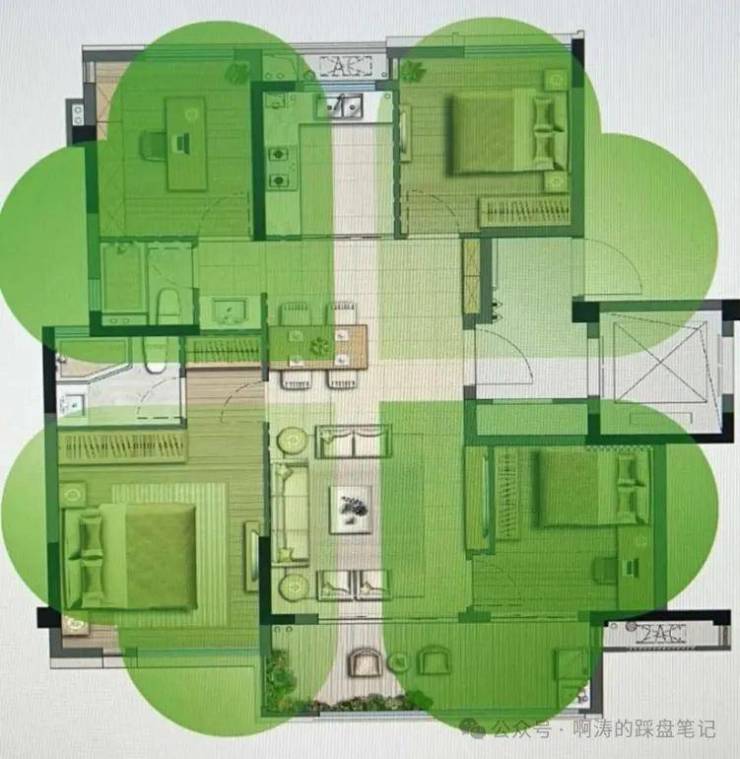 ·135平:餐客厅居中,四个卧室分布在四角,常规四叶草户型。