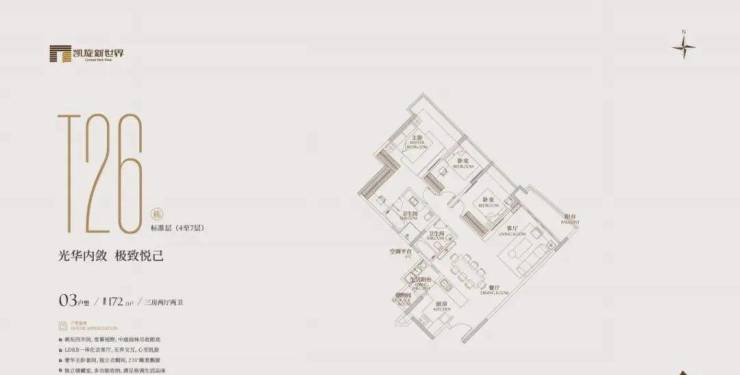 有172㎡、195㎡等多种面积。其中,172㎡的三房分布在t10、t26栋的3-9层,2梯3-4户,有三房两卫;195㎡的三房在t17栋的3-26层,2梯4户,有三房两卫。LDKB 一体化会客厅,朋友聚会超有面儿。