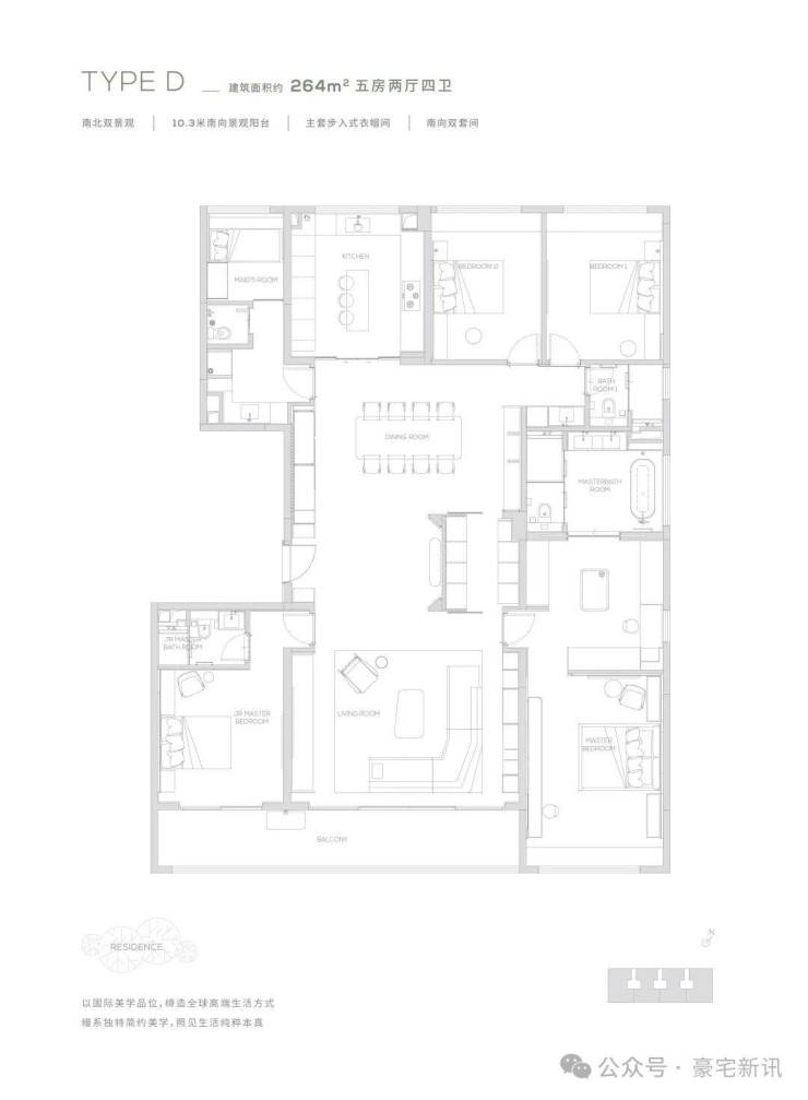 【264㎡户型】10.3米南向景观阳台-南北双景观-主套步入式衣帽间-独创灵动岛设计,生活场景多重切换