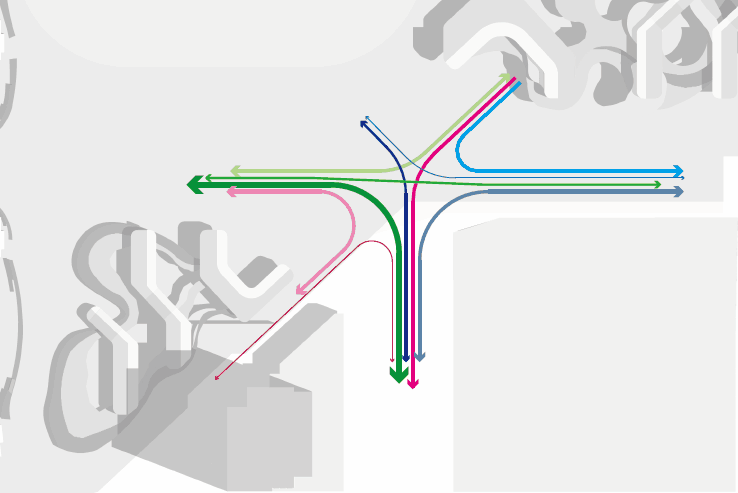 空中花园层盖下的公共商业空间,由标志性的交通核心进行串联——交通核整体形态通过一条似中国结的飘带,将原本复杂的动能、密集的出入口,多标高的平台,突兀的建筑体量包容一体,并形成半室外的遮阳遮雨空间,让归家、购物、求学的路更舒适,享受云社区带来的美妙时光。