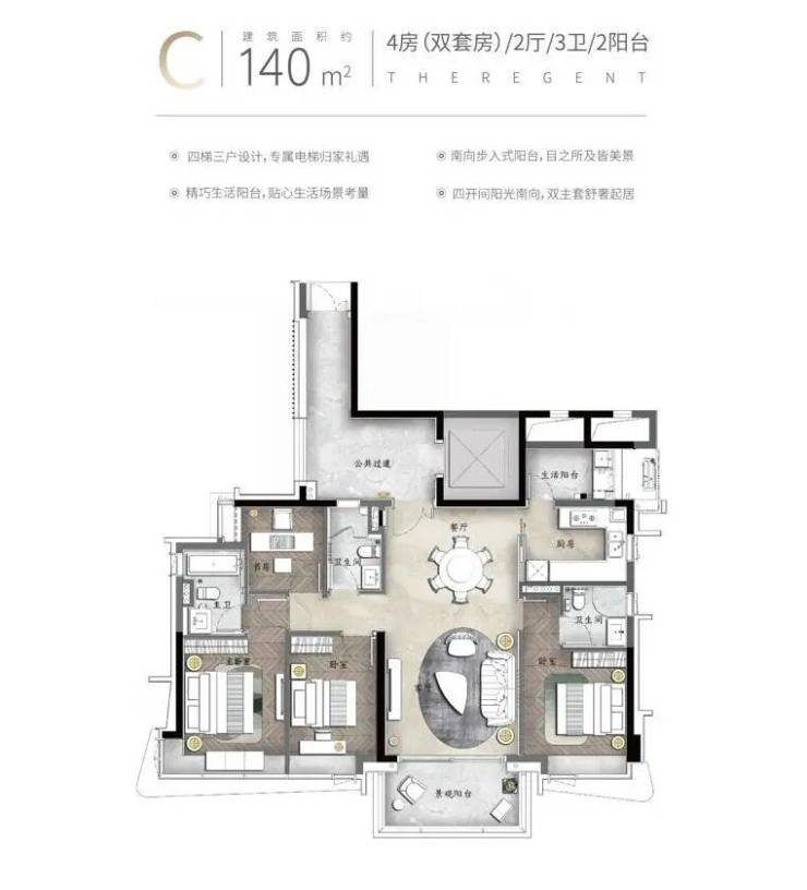 产品亮点:私家电梯入户、部分楼层三面采光、约3.4米层高、动静分区南北对流、约6.8米挑空餐客厅、中西双厨、四套房设计、部分房间带阳台设计