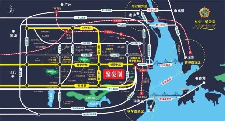 项目距离广澳高速收费站仅3分钟车程,半小时即可到达广州、佛山、珠海和澳门;同时,3分钟还可到达翠亨快线城区入口,接驳即将通车的深中通道,全程仅需35分钟即可到达深圳前海。