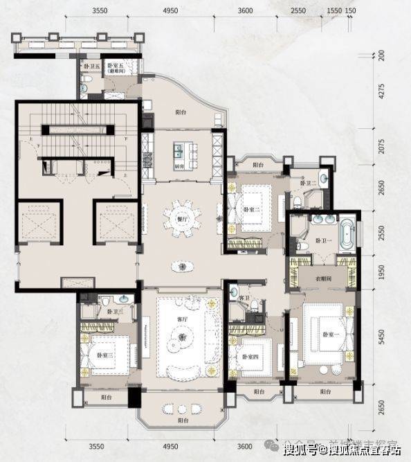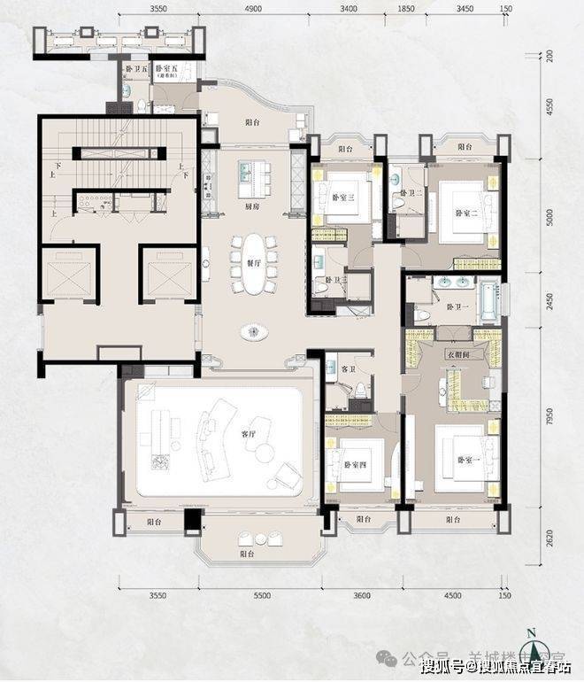 特A星蕴檀意:约398㎡五房三厅五卫,带休闲厅、水吧,可根据需要调整为六个房间。