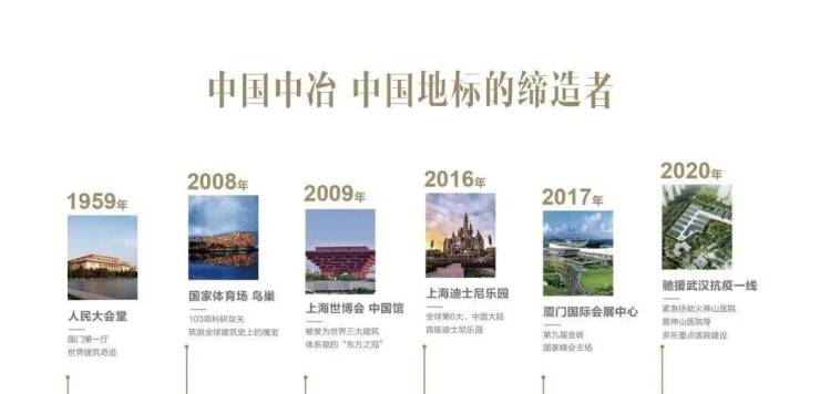 中国中冶,参建北京人民大会堂、鸟巢、上海世博会、上海迪士尼和珠海长隆等国家地标性建筑。