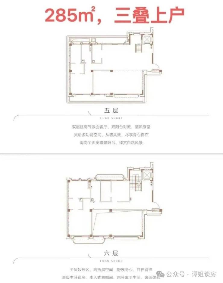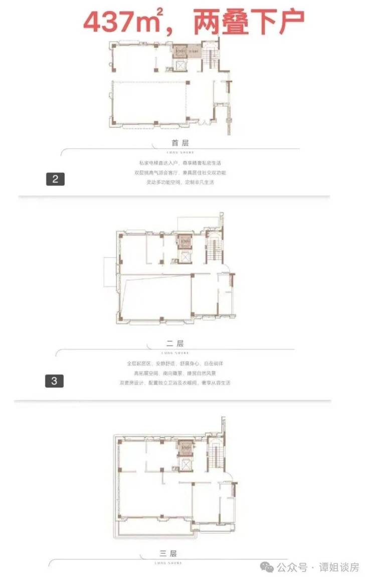 产品户型:两叠(上叠392㎡、下叠437㎡),三叠(上叠 285㎡、中叠279㎡、下叠305㎡)