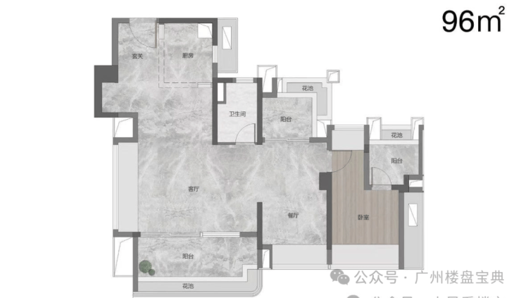 建面95平,该户型可以做三房或四房,项目的样板房是打通了一个房做了3房这样整体空间感会比较强。