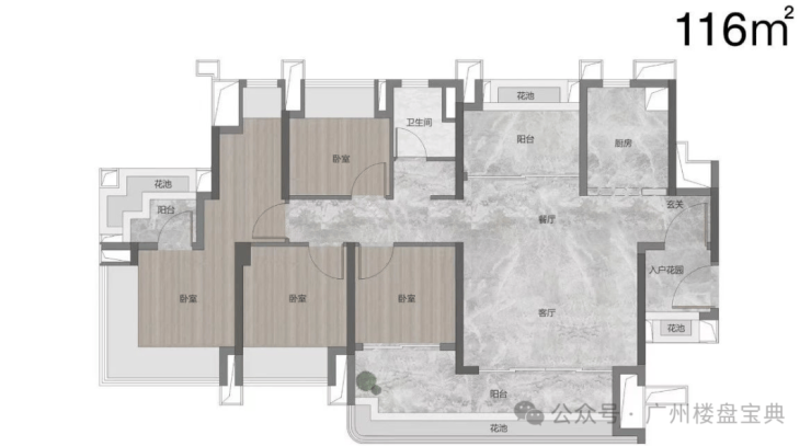建面116平,该户型并没有做样板房,带入户花园,五开间朝南,南北对流,通风和采光都非常好。