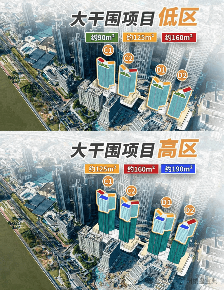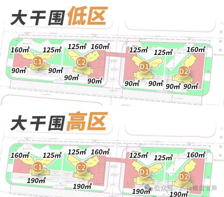 低区3-23楼,2梯4户,面积段有90、120、160平三个面积段。