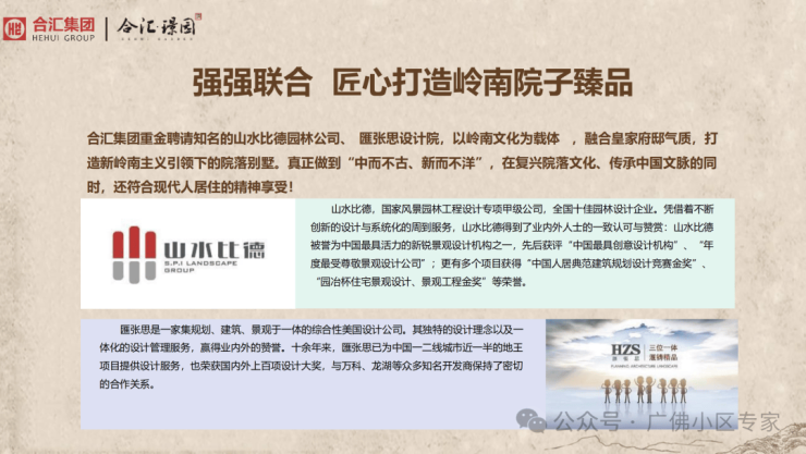 合汇璟园项目总占地面积约6.18万㎡,是由增城本土第一开发商,大师级品牌设计。合汇集团,创始于2004年,是一家异军突起的新锐房地产企业,以房地产开发为主业,涉及商业经营、物业管理、矿产资源开发等业务领域。项目邀请了众多名大师联手设计,其中有来自美国的全球顶尖规划建筑设计公司【匯张思】设计。园林设计上邀请了著名的山水比德,打造顶级别墅项目。