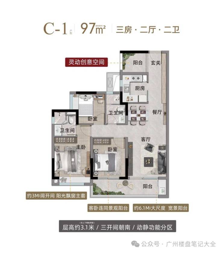·约3.1米层高,约6.1-9.4米宽景阳台,采光通风极佳