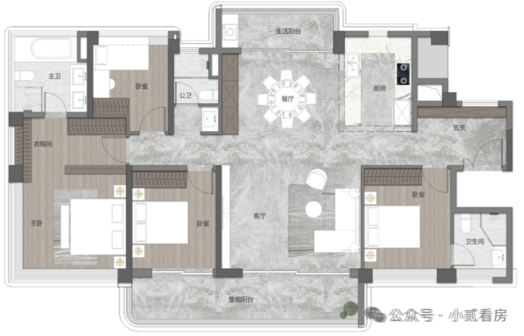 建面95㎡四房,南向看江景,主卧的270°环幕大飘窗,同样能把采光、景观进行了全面放大。