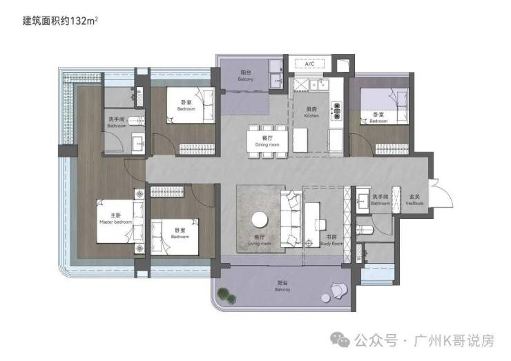 149㎡创意四房两卫,超大横厅连接环幕阳台,南北双阳台