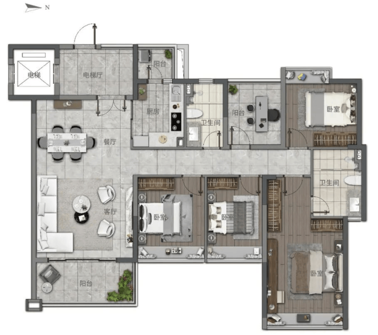 以建面约143㎡ 4+1房户型为例,带私家电梯厅,客饭厅直厅布局,厅出阳台。