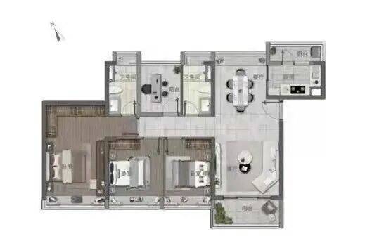 户型完全动静分区,但同时形成了长走廊占据了部分面积。4个卧室均带飘窗,主卧还有步入式衣帽间及独立卫浴。“+1房”目测面积较小,可用作书房或休闲室。