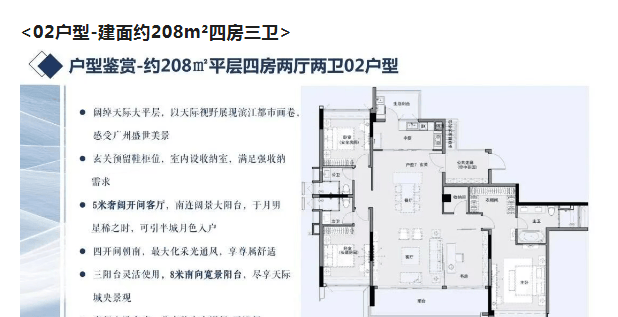 高区20-30层则是两梯两户的设计,户型为208-210㎡的大平层四房产品,整个项目住宅总共仅92户稀缺单位,产品户型主要面向市中心改善型客户群体。