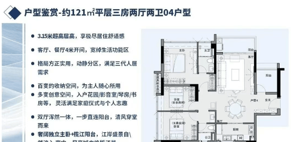 整个保利阅江台仅规划建设1栋30层高住宅楼,产品户型为121-210㎡平层三至四房。