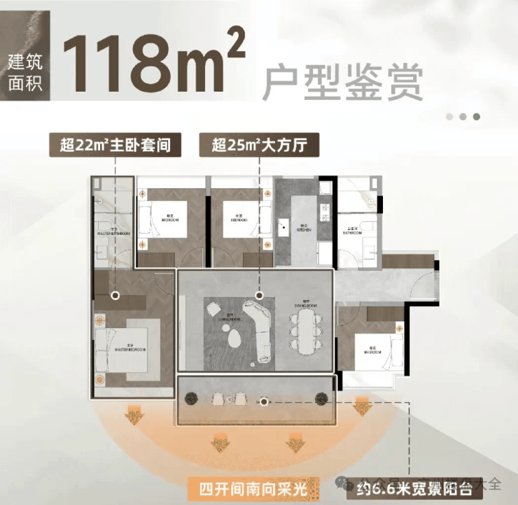 118方4房:大阳台、LDKB一体化设计,空间感很足,还有一个超8㎡的多功能空间可以灵活使用。主卧套间设计,飘窗进深达0.8米,可改造成书桌或休闲区,充分利用新规。吹风价:4.3-4.7万