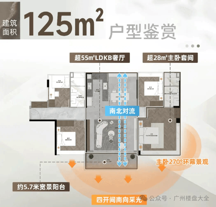 125 方4房: 南北对流,无论是公共空间还是卧室,空间感足够。主卧270°环幕飘窗,不仅加大了采光面,还有效地增加了空间的利用。风吹价:4.6-5.1万