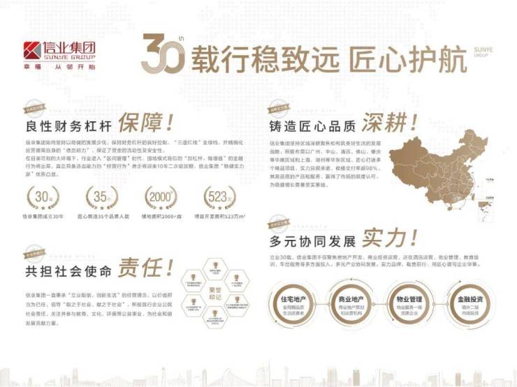 信业集团,成立于1993年,前身为美心地产,立足于广州。辐射华南、华东区域城市。集团的发展战略以稳健为主,诚信经营,资金充足,企业推行多元化发展战略,以房地产为主,经营涵盖各大行业,逐渐成为大型化集团企业