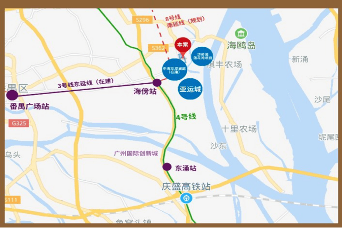 4号线海傍站,向北2站到思科智慧城,3站到大学城,6站到琶洲、7站到金融城,都是广州重点板块。 向南3站到庆盛站,通过广深港高铁,快速对接香港。