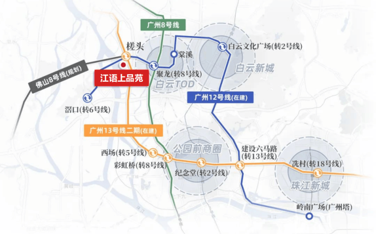 江语上品苑所在的珠江西航道地段,正处于白云区“五片协同、多核驱动”的核心发展区域。该区域被划为数字经济创新走廊,未来将依托华为等企业,推动产业集聚与发展,成为广州的新兴经济中心。交通方面,江语上品苑紧邻槎头地铁站,广州12号线和13号线将在2024年通车,未来还将有佛山8号线、白云二线等多条轨道交通线路贯通,使得出行非常便捷。项目距离新白云火车站和白云新城都仅需短短几站地铁,地理位置优势明显。