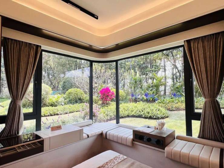 一般的项目转角位置要么是柱子要么是直角玻璃,我们采用了弧型玻璃,优点一看窗外风景时就像是拥有了广角镜头一样。二是广州多台风,弧形比直角更能承重坚固。唯一的缺点就是贵。