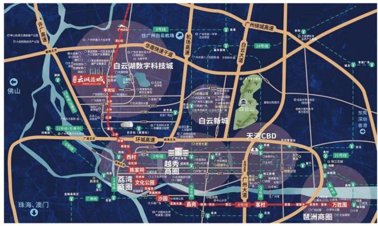 项目3公里范围内可接驳华快-朝阳站、许广-庆丰站,双高速贯通广州五大城区(越秀、荔湾、海珠、天河、花都)