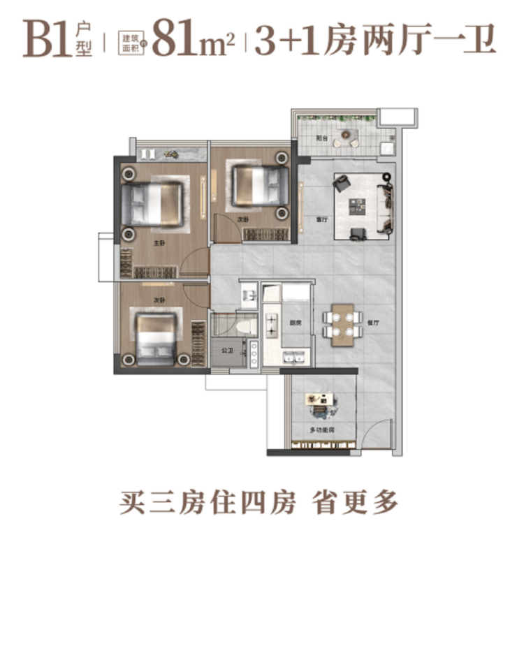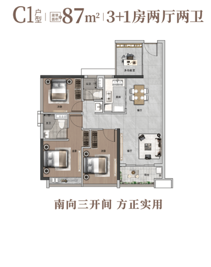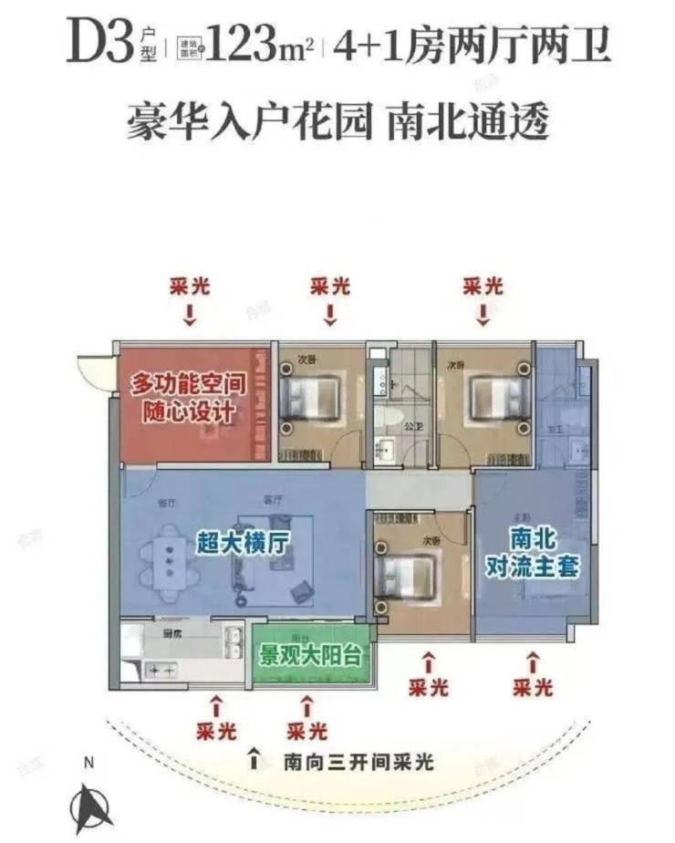 特点:园景四房,动静分区,方正实用,全明空间,通风采光佳。
