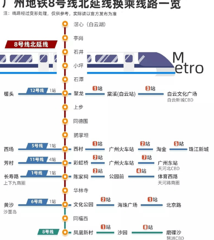 去年底广州白云站开通,是广州目前最大的交通枢纽站,串联全国各地,白云湖板块的交通越发便利。白云湖版块业主乘坐家门口的8号线,只需要3站即可直达广州白云站(地铁石潭站),未来白云站有七条地铁线路汇集中轴换乘,交通将更加便捷。