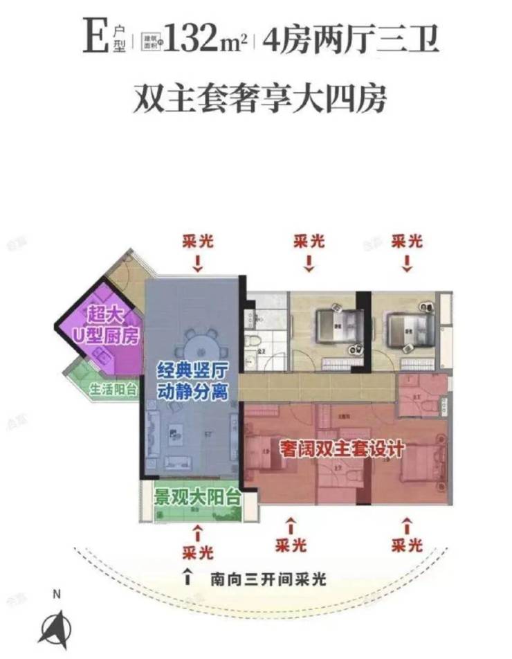 特点:奢阔双主套,尊贵步入式衣帽间,超宽景观阳台,真正南北对流,超大U型厨房配生活阳台,卧室飘窗全赠送,多一处空间,多一种生活享受。