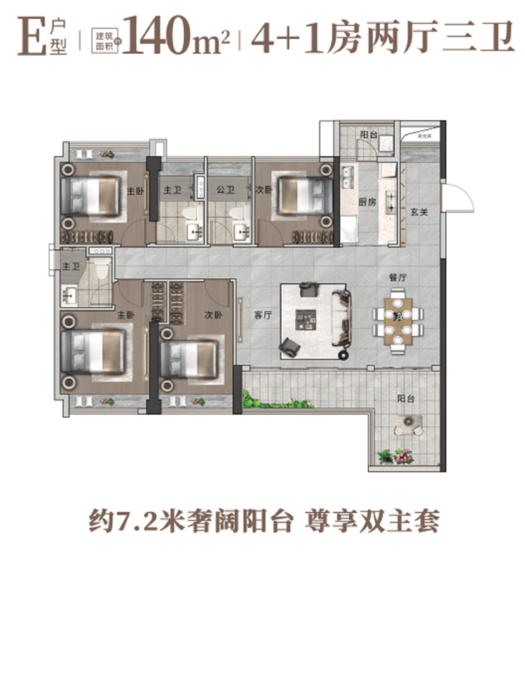 特点:约7.2米奢阔阳台 尊享双主套,单边户,三面采光,双主套设计,私密性强。