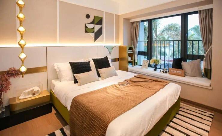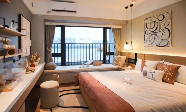 飘窗呢,做到大面宽,且是凸窗,尺度宽敞,视野开阔。注意了,这个小户型竟然是江景房,阳台一线瞰江,三个卧室也瞰江。市中心如此小面积的江景房,有几家能够?