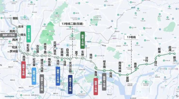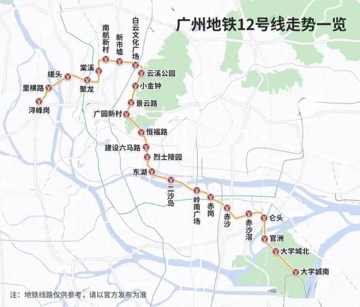 12号线(2025年已经通车)-广州换乘之王,广州市第一条无人驾驶地铁线路,与十数条轨道线无缝换乘,共经过白云文化广场、烈士陵园、二沙岛、赤沙等17个换乘站,可直达大学城,连通白云、越秀、海珠、番禺四大区域。