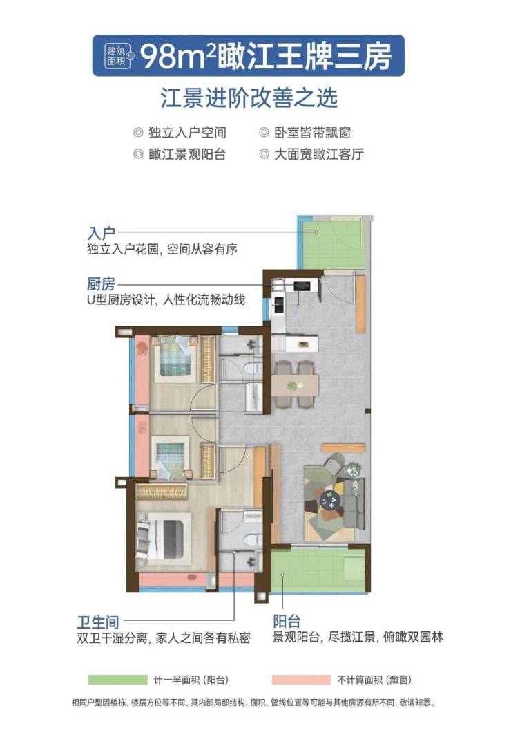 建面约98㎡,升级大面宽可瞰江客厅,延伸生活空间。同时,还有独立主套,三代同堂互不干扰。